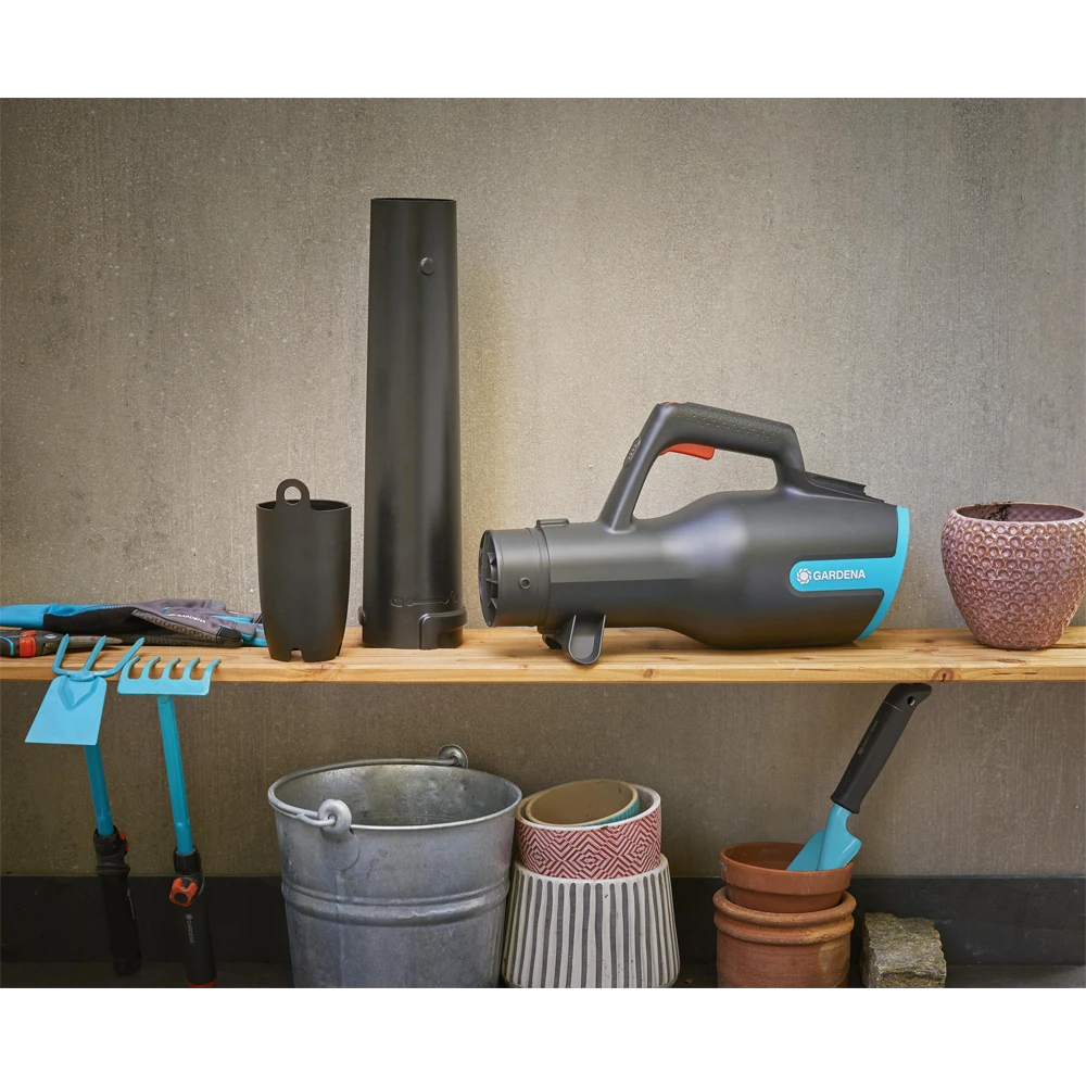 De PowerJet 18V P4A kant-en-klare set van GARDENA is een accu-aangedreven bladblazer waarmee u de tuin flexibel, snel en effectief kunt opruimen. Dit veelzijdige product is ideaal voor gebruik in de tuin en rondom het huis. De bladblazer maakt niet alleen indruk met zijn slimme en functionele ontwerp, maar vooral met zijn opmerkelijk krachtige blaasprestaties. Of het nu gaat om bladeren, kleinere takken of gemaaid gras, de PowerJet blaast ze snel, krachtig en efficiënt weg. Dankzij het innovatieve ontwerp en het hoge luchtdebiet ziet uw tuin er in een mum van tijd verzorgd en opgeruimd uit. De blazer maakt indruk met een maximaal luchtvolume van 7,9 kubieke meter per minuut voor geweldige blaasprestaties en stelt u in staat een gebied tot 400 vierkante meter schoon te maken. Afhankelijk van gebruik en tuintoepassing kan het toerental van de bladblazer individueel worden aangepast. Dankzij het lage gewicht is het werken met de bladblazer uiterst comfortabel en gemakkelijk, zelfs over de volledige maximale looptijd van 13 tot 23 minuten, afhankelijk van het ingestelde vermogen. De blazer is ook zo goed uitgebalanceerd dat er geen vermoeidheid is in de polsen en armen. Dit wordt nog versterkt door de uitstekende ergonomie van het product. Een duidelijk zichtbare LED-display op het apparaat toont het huidige laadniveau van de accu. Deze set biedt u nog meer: de set bevat ook nog een extra, bevestigbaar precisiemondstuk. Dit mondstuk vergroot het bereik van de bladblazer, waardoor u nog preciezer kunt werken in die lastig te bereiken hoeken in uw tuin en biedt meer flexibiliteit bij het aanbrengen. De krachtige, compacte en handige GARDENA accu-bladblazer is daarom ideaal voor een breed scala aan schoonmaakklussen.