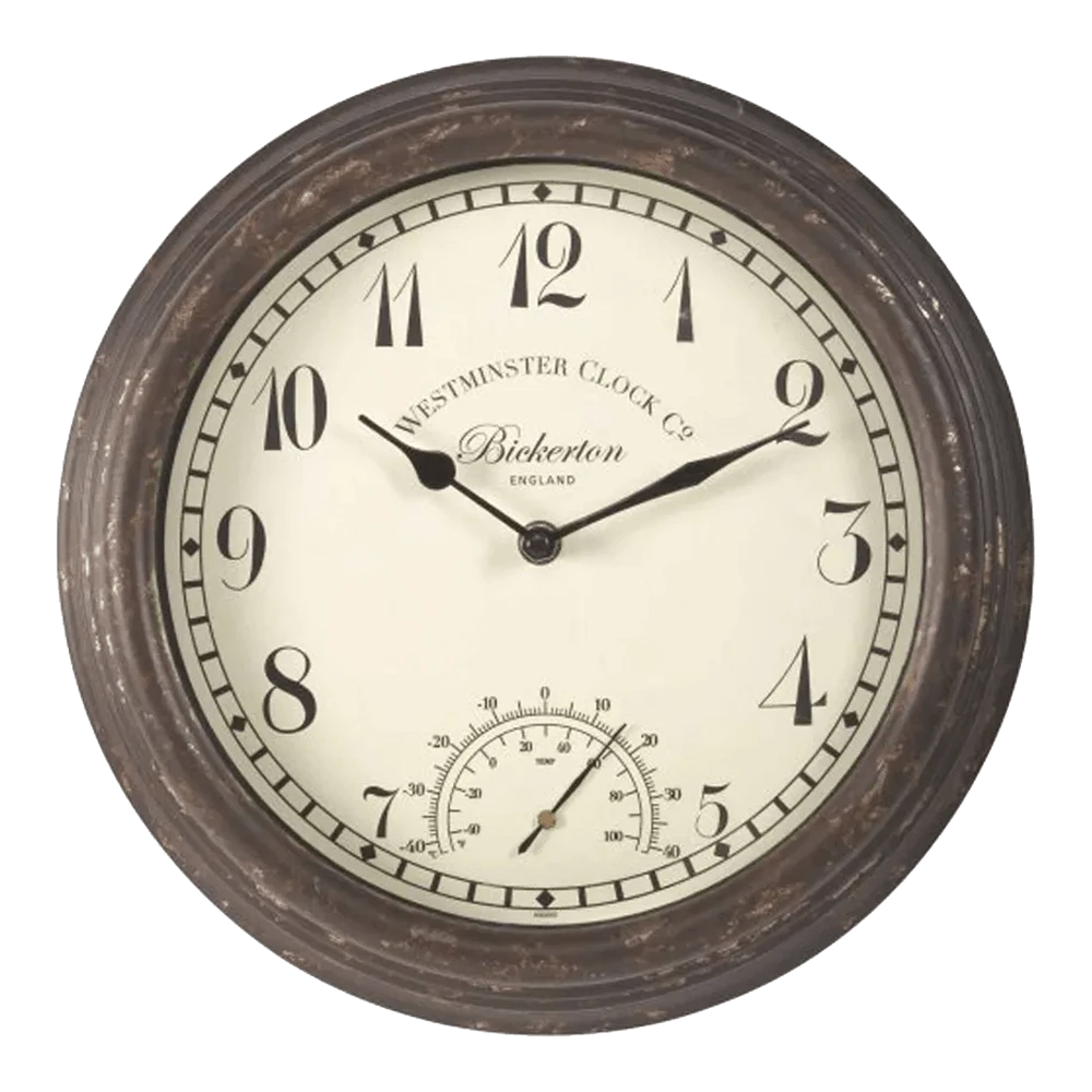 Klassieke klok met bruin verweerde rand.Met sierlijke arabische cijfers en met thermometer. Heeft 1 AA batterij nodig om te werken. 2 jaar garantie.
