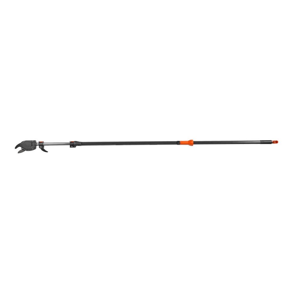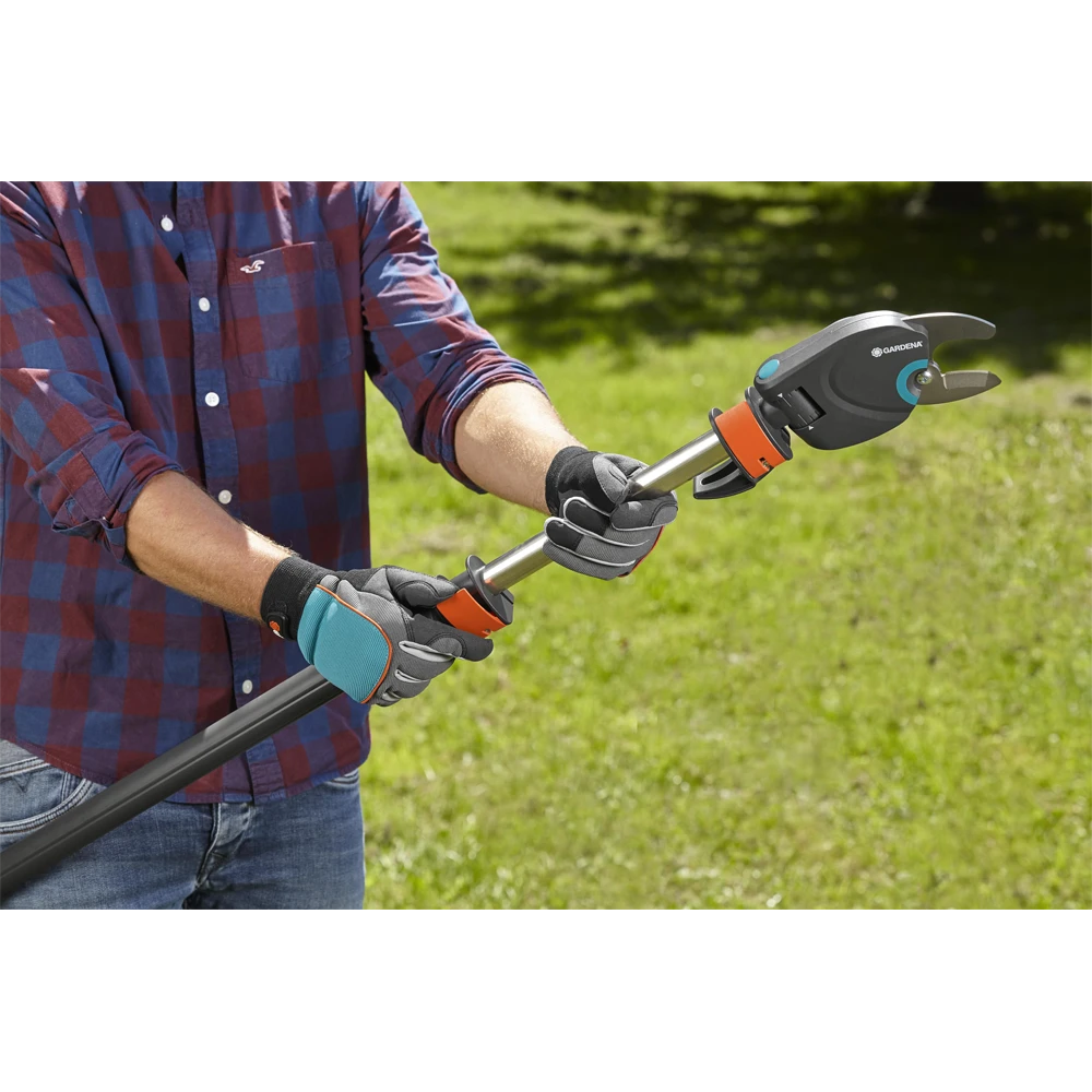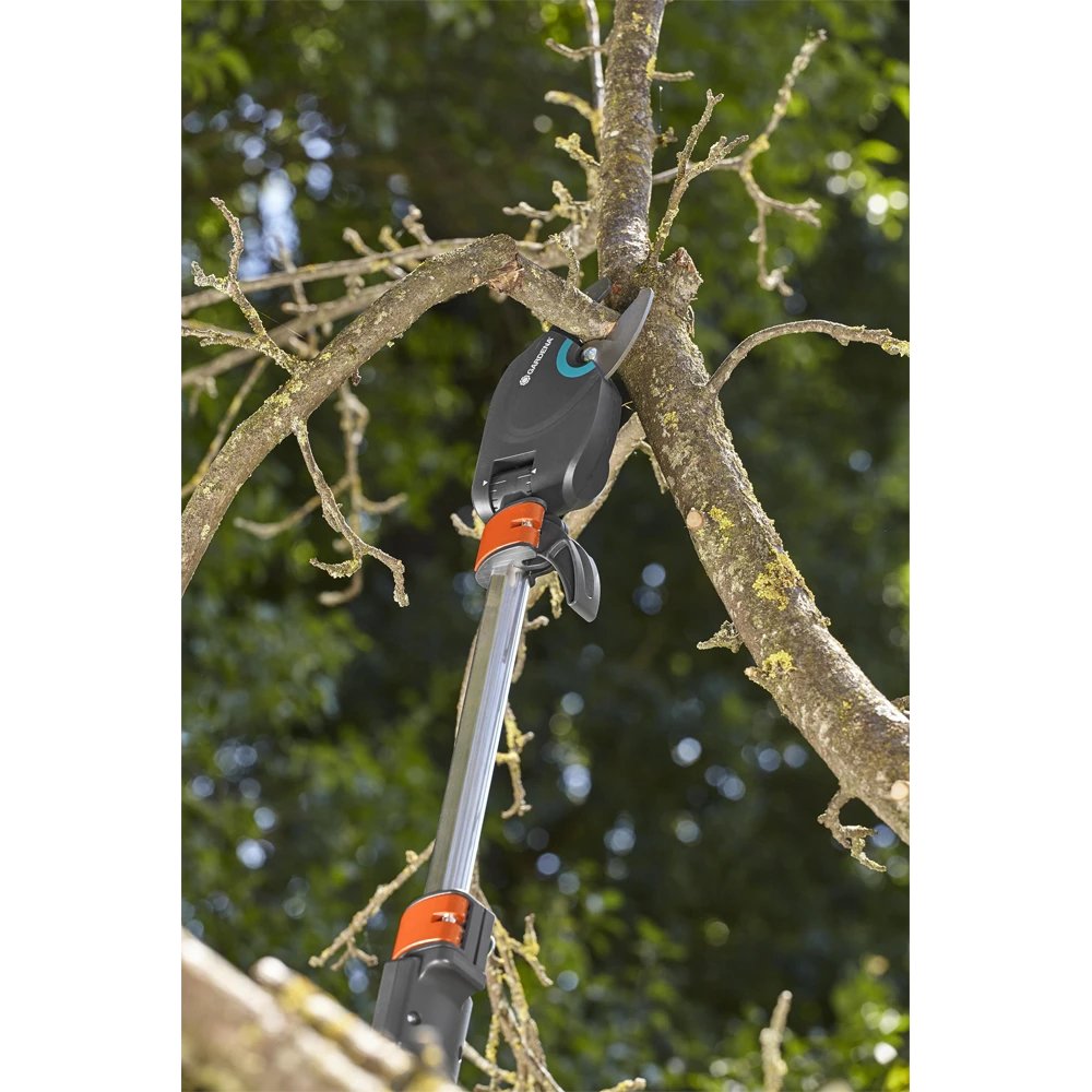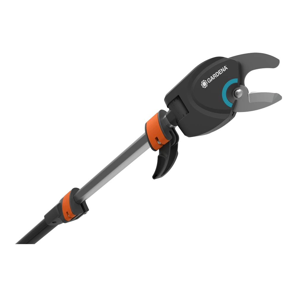 De nieuwe GARDENA telescopische boom- en takkenschaar StarCut 410 plus is de specialist voor het onderhoud van hoge bomen en struiken. Hij heeft een telescopische aluminium steel die traploos kan worden versteld van 230 tot 410 cm. Dit maakt de GARDENA Telescopische StarCut 410 plus nog flexibeler in gebruik en biedt een bereik van maximaal 6,5 m, inclusief de lengte van de gebruiker. De 12-voudige transmissie zorgt voor krachtig snoeien van takken met een diameter tot 32 mm. De nieuwe verstelbare haak voor het verwijderen van afgesneden takken zorgt voor extra comfort tijdens boomonderhoud. Hiermee kunt u gezaagde takken zonder problemen van de kronen van bomen verwijderen. De GARDENA Telescopische StarCut 410 plus heeft een intern mechanisme voor katroloverbrenging dat voorkomt dat het tijdens het snoeien in takken blijft haken. De extra lichte en slanke snijkop maakt handig en gericht snijden zelfs in de buurt van de kofferbak mogelijk. De snijhoek kan individueel vanaf de grond worden aangepast. De precisiegeslepen, niet-klevende messen verminderen de weerstand bij het zagen en garanderen een eenvoudige reiniging. De trekhuls met de slipstop en een extra T-hendel zorgen voor een aangename en veilige bediening. De GARDENA Telescopische StarCut 410 plus is ‘Made in Germany’.