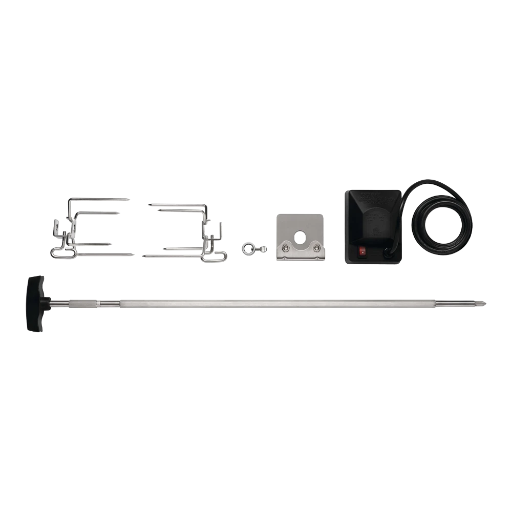 Draaispit-set in Heavy Duty uitvoering: Met 2 RVS vleesvorken, RVS draaispit (vierkant) en motor met zwarte kunststof behuizing. Geschikt voor de Freestyle® serie.