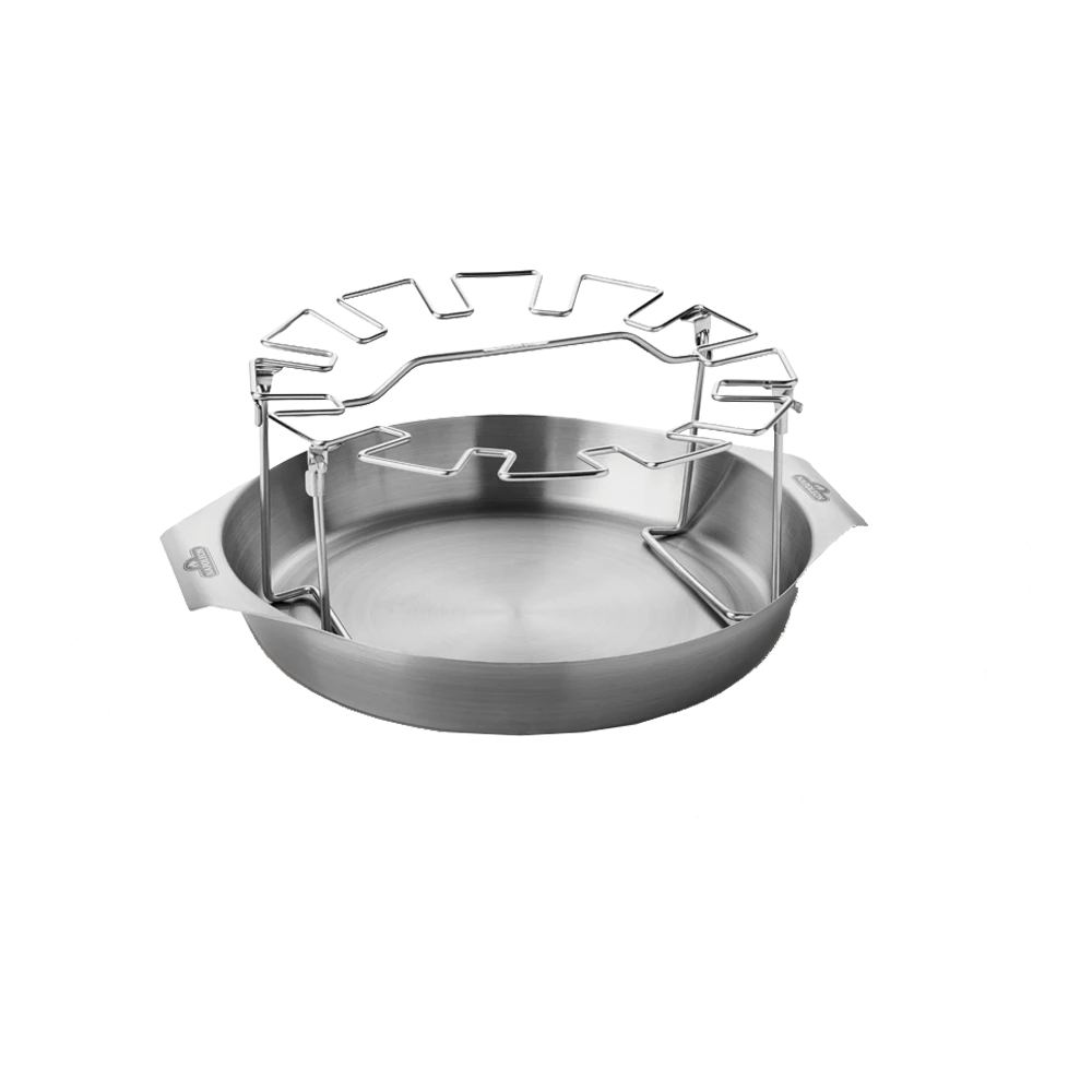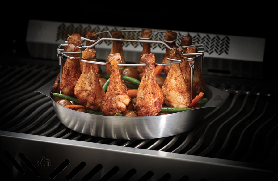 RVS drumstickhouder met opvouwbaar rek voor een gelijkmatige hitteverdeling. 12 gleuven voor kippenpoten of drumsticks. De schaal is ook los te gebruiken voor gerechten als paella.