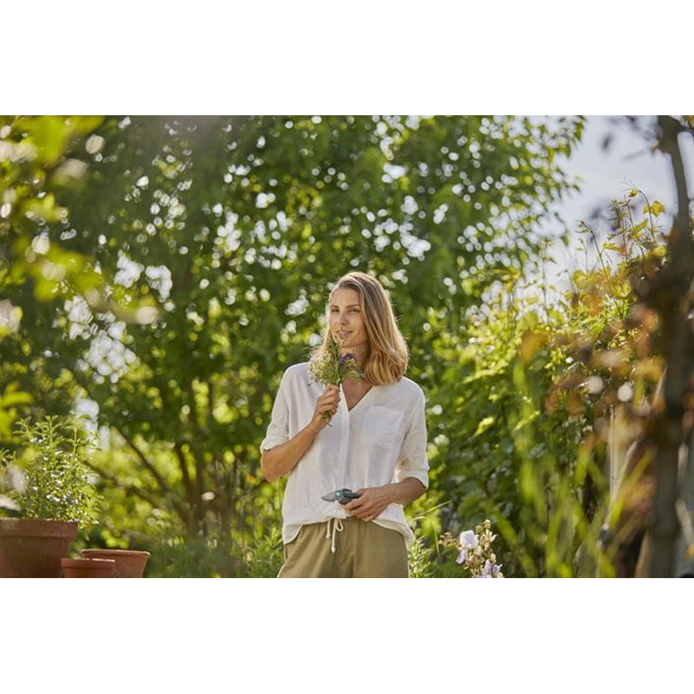 De EcoLine Snoeischaar van GARDENA is een moderne en duurzame klassieker. De snoeischaar heeft een snijdiameter van 18 mm en werkt nauwkeurig en krachtig. Deze snoeischaar is ideaal voor het afknippen van bloemen en jonge scheuten Hij is vervaardigd uit kunststof dat uit meer dan 80 procent materiaal gerecycled uit huishoudelijk afval bestaat. Daarmee is het een eco-vriendelijke optie voor groene tuiniers. De bladen van de snijkop zijn van roestvrij staal gemaakt. Meer dan 75 procent van de stalen onderdelen van de snoeischaar bestaat uit gerecycled materiaal. Het gebruikte metaal is niet alleen duurzaam, degelijk en robuust, het zorgt ook voor een elegant en tijdloos design. De precisiegeslepen messen werken volgens het bypass-principe en zorgen ervoor dat u nauwkeurig en moeiteloos kunt snoeien. Dankzij de ergonomische greep van de snoeischaar wordt het handmatig snoeien van planten een peulenschil. Andere praktische kenmerken van de EcoLine Snoeischaar zijn de sapafvoer en de draadknipfunctie. Met de enkelhandige veiligheidsvergrendeling kan de snoeischaar gemakkelijk worden vergrendeld en veilig worden opgeborgen. Dit kwaliteitsproduct wordt in Duitsland vervaardigd en wordt door GARDENA gegarandeerd met 25 jaar fabrieksgarantie. Een natuurlijke keuze voor tuiniers met passie. ReTh!nk – De nieuwe EcoLine serie. Verantwoord geproduceerd. Esthetisch ontworpen. Duurzaam vervaardigd.