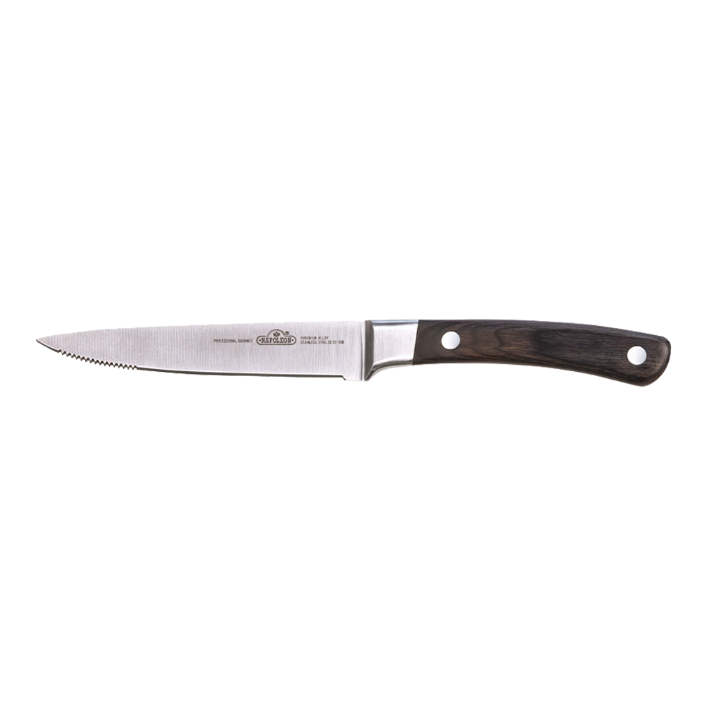 Het steakmes met geklonken rozenhouten handvat glijdt moeiteloos door een dikke steaks met zijn 12,7 cm lange mes. Het mes is gesmeed en uitgeballanceerd en maakt indruk met zijn Duitse design.