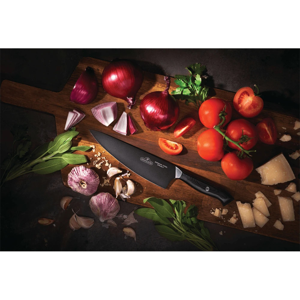 Gebruik het Phantom™ Chef mes en u zult nooit meer een ander mes willen gebruiken om uw gerechten te bereiden. Dit vlijmscherpe stalen mes met titaniumlaag glijdt gemakkelijk door het voedsel en is geschikt voor al uw gerechten. Dit ideale, universele koksmes van 20 cm voldoet aan al uw kookbehoeften. Het mes is over de gehele lengte vervaardigd uit staal en is daarom perfect gebalanceerd. Het dubbel genagelde handvat biedt ergonomisch comfort terwijl u snijdt, hakt, trancheert en fileert. Dus of u nu een gourmetgrillmeester bent of een fanatieke fijnproever, het Phantom™ Chef mes is perfect voor al uw gerechten.