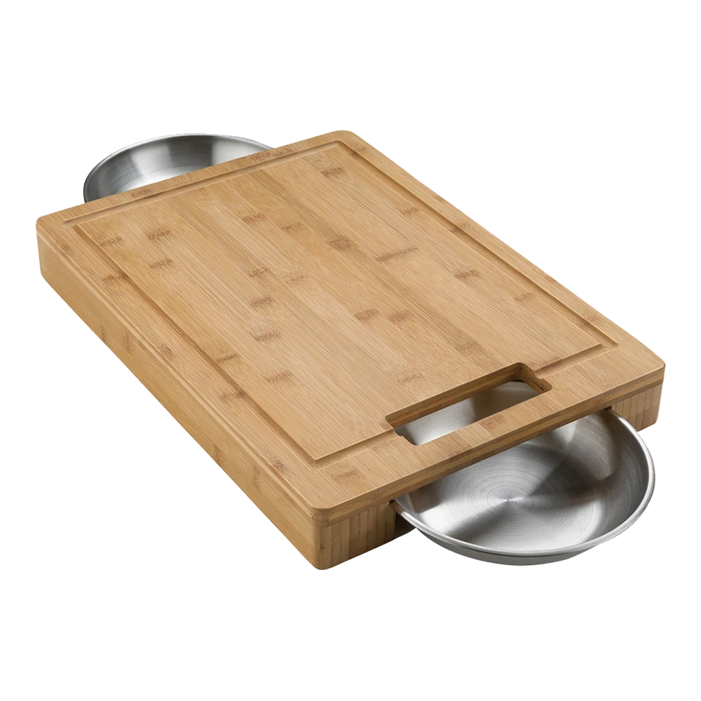 Hoogwaardige bamboe snijplank met 2 RVS kommen voor het opvangen van vleessappen en gesneden groente. Afmeting: 33 cm x 46 cm x 5,5 cm