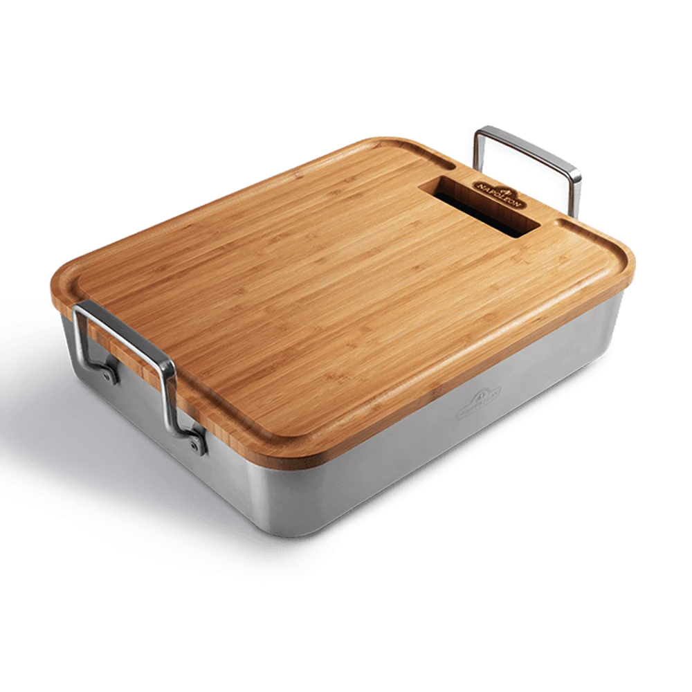 Deze braadpan van hoogwaardig RVS met bamboe snijplank is ideaal voor het bereiden van een uitgebreid familiediner, of u nu uw Napoleon-grill of de oven gebruikt. Bamboe is het perfecte materiaal voor snijplanken, omdat het van nature een antimicrobiële werking heeft. Gebruik de snijplank bijvoorbeeld om groenten voor een bijgerecht fijn te snijden. De uitsparing is handig om afvalresten te verwijderen of voedsel naar de braadpan te verplaatsen en kan gebruikt worden als handvat. Laat het gegaarde vlees even rusten op de snijplank voordat u het opdient. Het gootje vangt de vleessappen op, die u kunt gebruiken om jus en sauzen op smaak te brengen. De RVS braadpan is diep en dus ideaal voor het opvangen van sappen en het roosteren van groenten en natuurlijk braadstukken. De stevige handvatten zijn met klinknagels bevestigd aan de pan, zodat het gemakkelijk is om grote gerechten van en naar de barbecue of de oven of verplaatsen of om de pan in de vaatwasser te doen. *De snijplank mag niet in de vaatwasser.