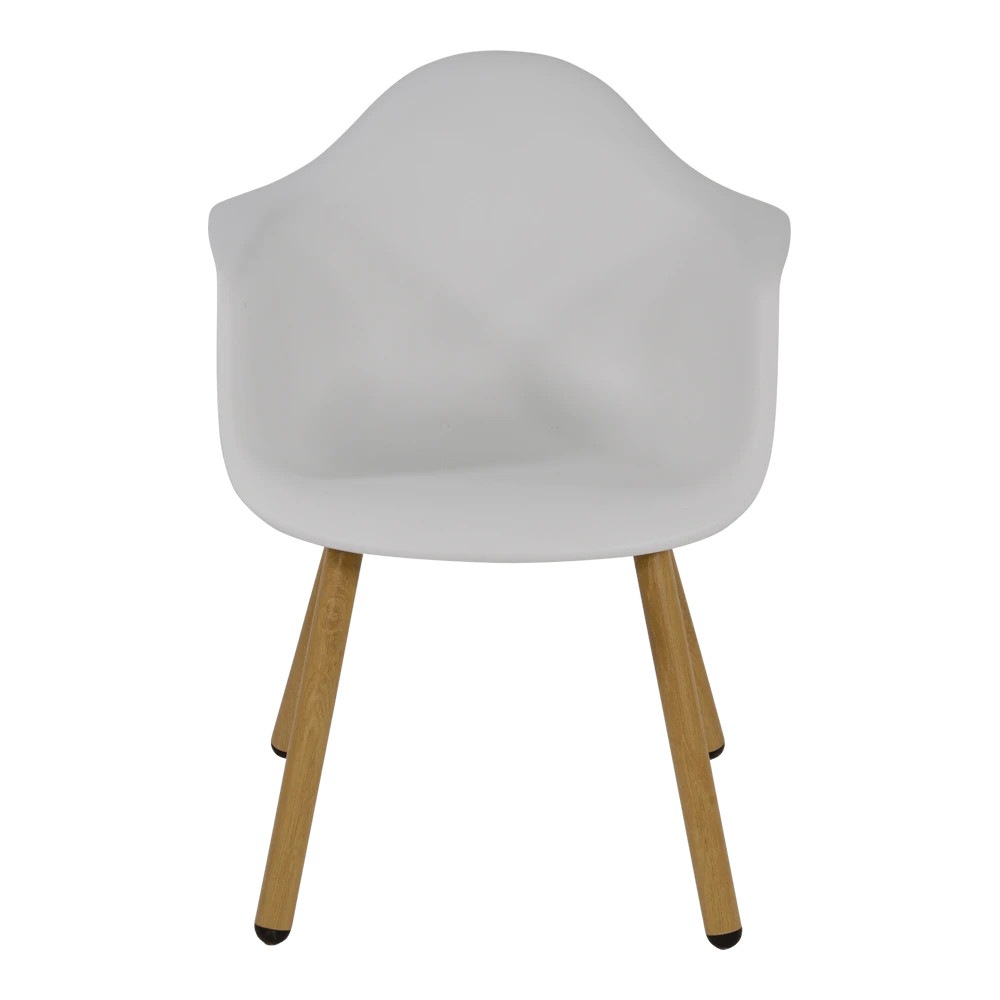 Het onderstel van de stoel heeft een houtlook, maar is vervaardigd uit aluminium. Hierdoor staat het niet alleen mooi, maar is de stoel ook onderhoudsvriendelijk! Het zitgedeelte is gemaakt van kunststof en bevat gaatjes voor de afvoer van (regen)water. Kunststof is sterk, onderhoudsarm en licht in gewicht. Beide materialen zijn zeer geschikt voor buiten.