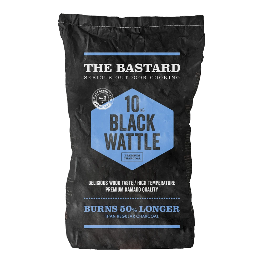 The Bastard Premium houtskool is een houtskool met hoge kwaliteit, speciaal voor de kamado, die gegarandeerd 50% langer brandt dan gewone houtskool. The Bastard Black Wattle houtskool is een zorgvuldig samengestelde selectie van 100% houtskool van grote en middelgrote stukken snelgroeiend acacia hout uit Zuid-Afrika. Dit hout garandeert een lange brandduur, met hoge temperaturen en geeft een delicaat aroma.